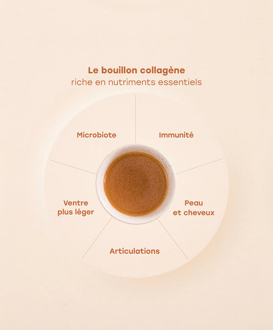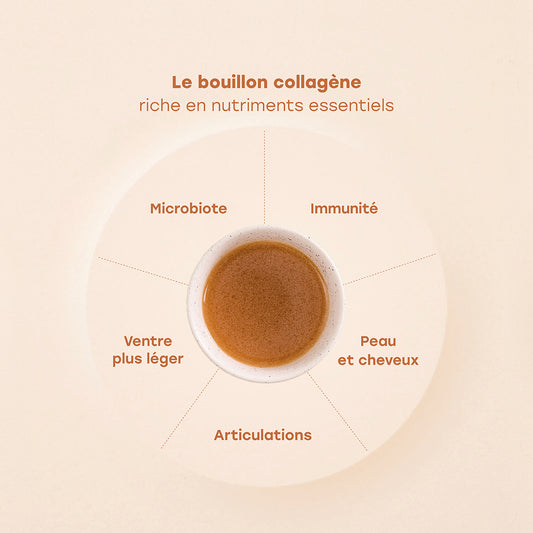 Grâce à sa forte teneur en collagène, en glycine et en glutamine, ce bouillon aide à accélérer la cicatrisation après une césarienne ou un accouchement par voie naturelle. Il soutient également la réparation des muscles sollicités pendant la grossesse et l’accouchement, favorisant ainsi une récupération plus rapide.