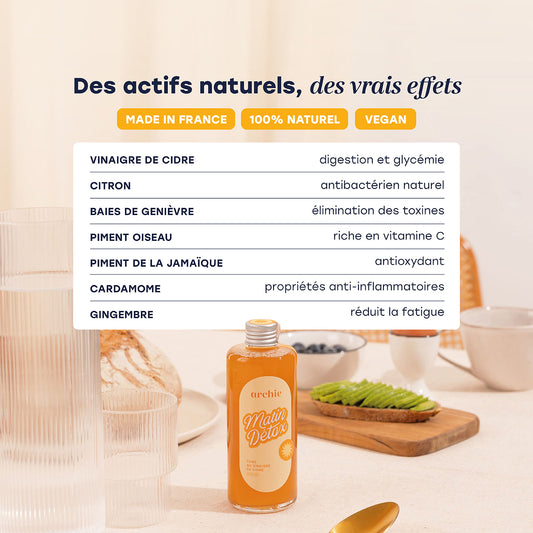 *To date, there are no published French scientific studies on the benefits of apple cider vinegar. To address this information gap, Archie has formed a Scientific Committee dedicated to providing the greatest possible transparency regarding the benefits of apple cider vinegar.