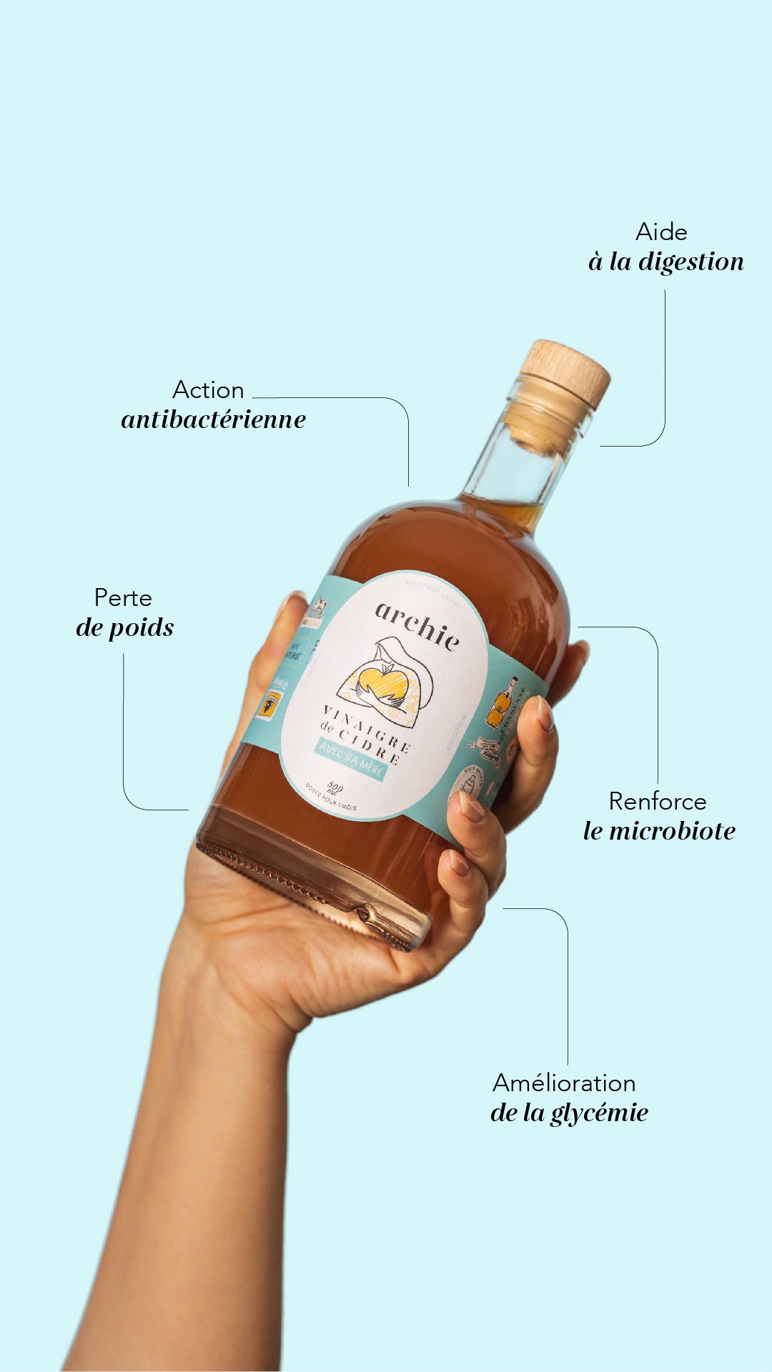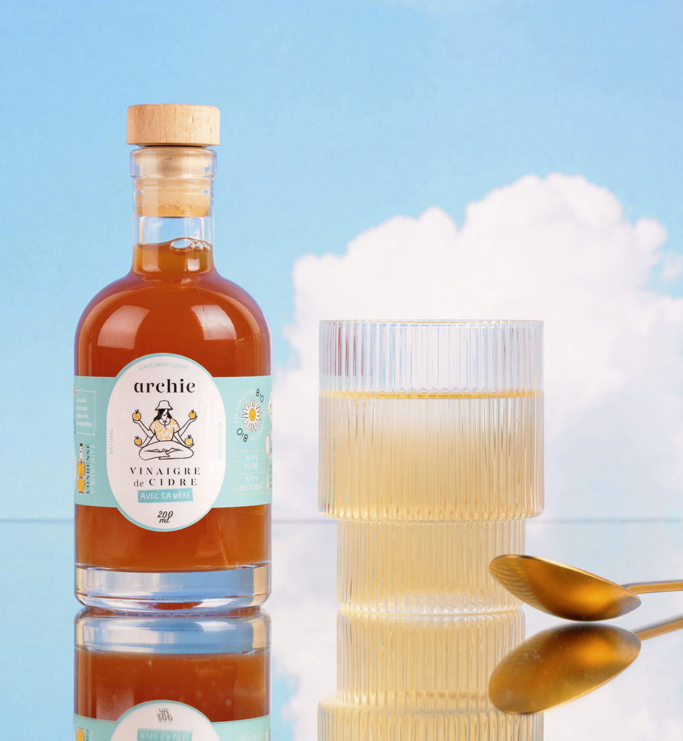 - Strengthen the immune system: Known to eliminate bad bacteria, apple cider vinegar is an antibacterial that acts as a 100% natural disinfectant. For example, it helps relieve a slight sore throat or a congested nose. Scientific research has also shown that a healthy intestinal microbiota protects us from the onset of diseases. However, to keep it in good shape and strengthen our immune system, it is important to diversify the sources of good bacteria, like those contained in Archie products.