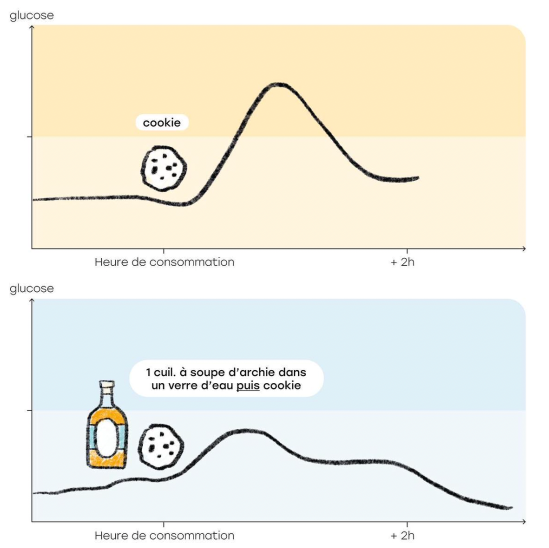 - Regulate blood sugar: A meta-analysis has shown that a tablespoon of cider vinegar diluted in water before a meal reduces its glycemic impact by 30%, i.e. the quantity of glucose present in our body. blood. Indeed, acetic acid regulates blood sugar and insulin, at the same time limiting the transformation of sugars into triglycerides and the formation of new fat cells. An experience validated in the same way in diabetic people as in non-diabetic people.