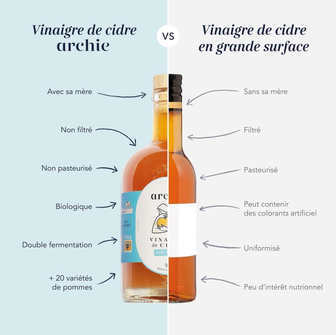 - Composition: Our Archie cider vinegar contains the “mother” of vinegar. It contains a concentration of good bacteria, nutrients, minerals and vitamins. This is an indicator that our product is alive, pure, and full of benefits for the body. Unlike industrial vinegars, our vinegar is neither filtered nor pasteurized. In contrast, classic vinegars can be deprived of the "mother", filtered, and subjected to pasteurization, which removes bad bacteria.