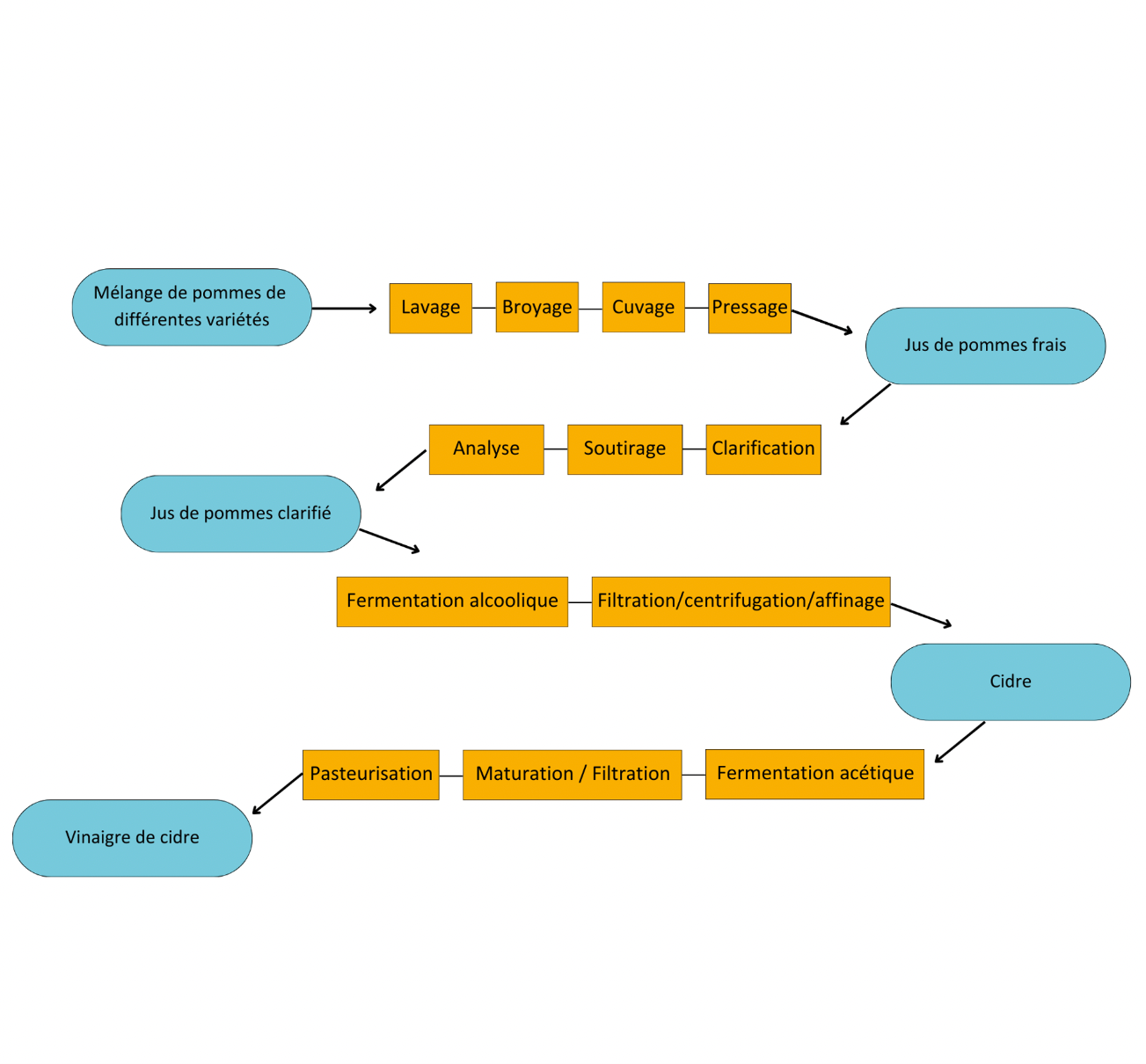 After washing, crushing and pressing the apples to obtain apple juice, a first fermentation takes place, alcoholic fermentation, to transform the apple juice into cider. Then a second fermentation, acetic fermentation to make this cider, cider vinegar.